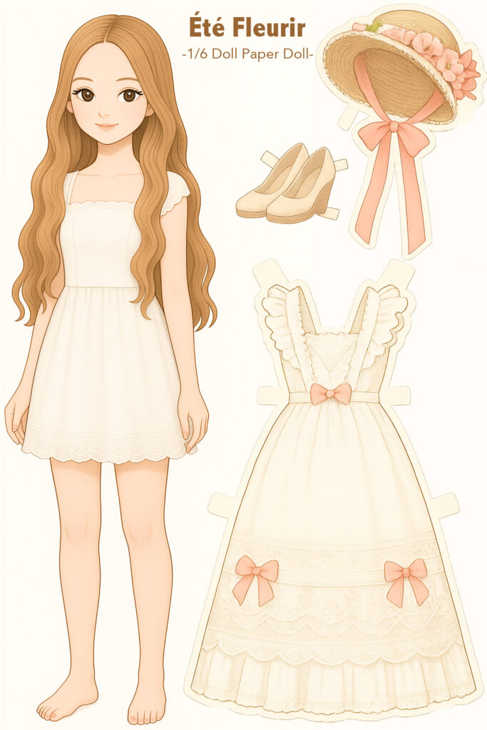 ワンピースはノースリーブの軽やかなシルエットで、ギャザーフリルの重なりが風に揺れるたびに涼を感じさせてくれます。裾には淡いコーラルピンクのリボンを添えて、ほんのり夏の彩りを。
