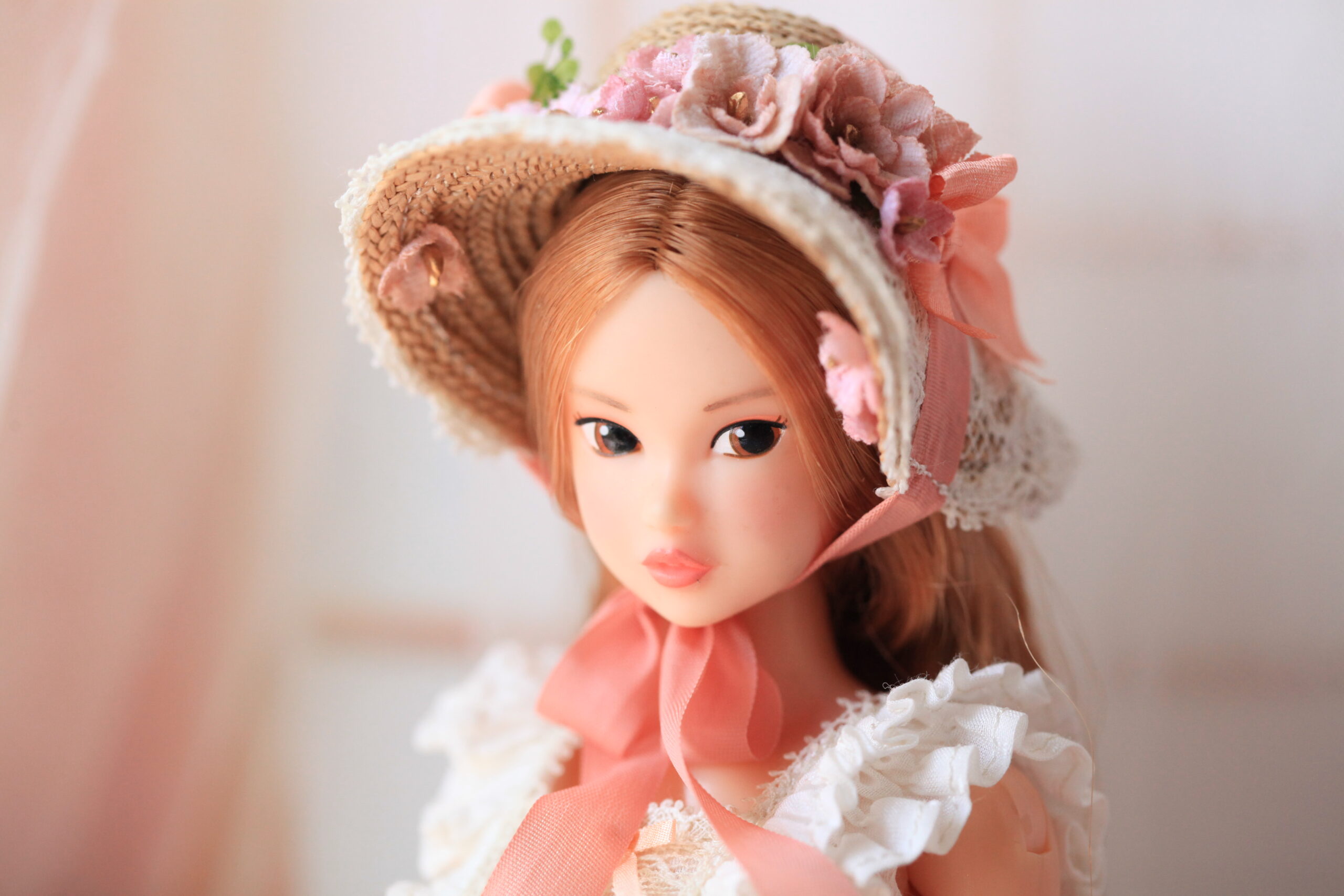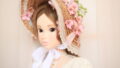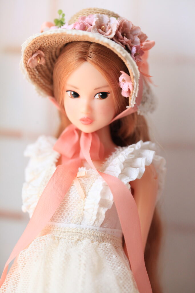 淡くくすんだピンクのリボンが、顔まわりを優しく彩ります。